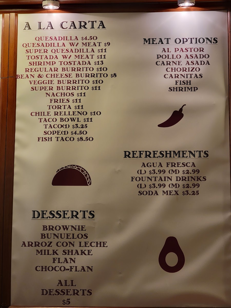 your choice of meat, beans, jalapenos, tomato, avocado, onion, sour cream, and cheese